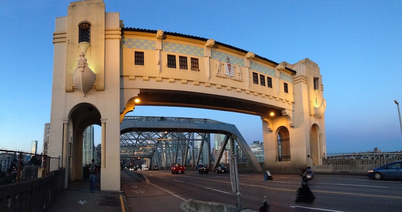Great shot from by my wife of the art deco entrance to the Burrard Bridge, just around the corner from our home in downtown Vancouver.