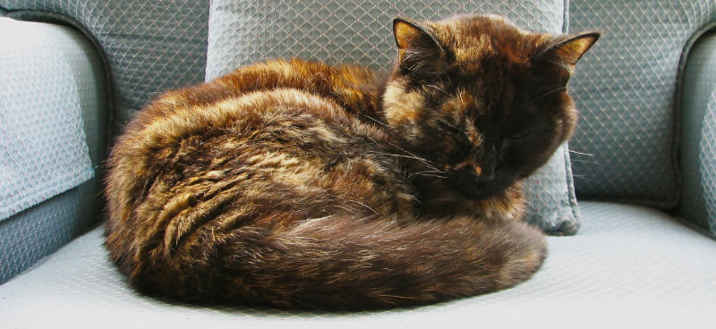 Here are a couple of my favourite photos of Cali, as the five-year anniversary of her death draws near: one from her youth (from years before I knew her), and one from right near the end of her lovely mellow life, looking a little frail and even a bit kitten-ish.