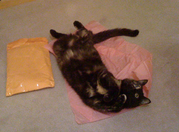 Once upon a time, there was a lovely cat in our home, and also some pink crêpe paper. She lost her mind over that paper. Merely sitting on it was simply not good enough: she also had to roll around on it, swat it, rustle it, tear it. It was a crepe paper party!