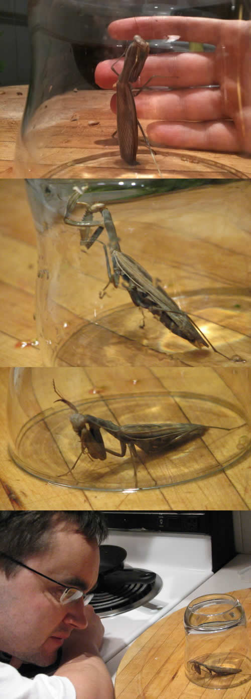 Heart racing, I carefully teased the monster out of the spinach trap and into a tumbler. It was a praying mantis! Bear in mind that a praying mantis is a powerful predatory insect: a bug with significant heft that can and does attack, kill and eat small animals. I felt the fear.