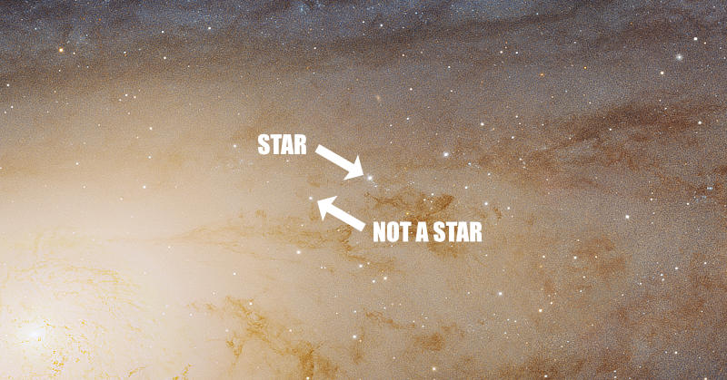 Many other bright points of light here are actually stars, but they are in the foreground, in the Milky Way… and some are stars in Andromeda that are extremely bright. Weirdly, there’s no easy way to tell the difference. From our vantage point, there is effectively no difference between an insanely bright star at a great distance, a much dimmer one that’s nearby, or a medium-brightness star at a medium distance! Astronomers have ways of distinguishing them in most cases, but it’s basically impossible just from the photo.