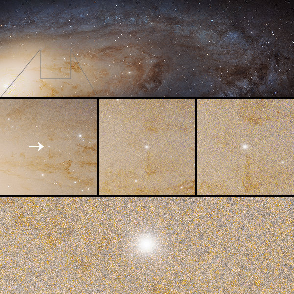 When we see the glow of a galaxy, it’s mostly the combined light of an insane number of stars we’re seeing, not individual stars. In fact, many of the “individual” points of light visible in this photo not stars, but vast symmetrical “globular” clusters of hundreds of thousands of stars. This is true of most pictures of near-ish galaxies: their globular clusters look like individual stars. But in this image, you can actually zoom in and watch a “point” of light turn into an uncountable swarm of stars.