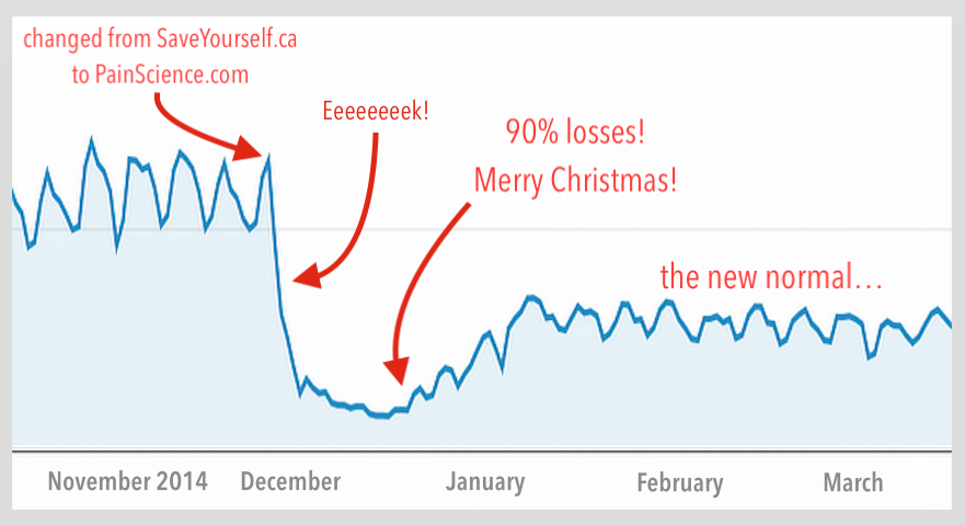 Moving my business from SaveYourself.ca to PainScience.com in late 2014 was a cock-up of epic proportions — the worst setback I’ve suffered as an entrepreneur. I lost about half my search rank, traffic and revenue, less than two years after I’d finally reached goals I’d set a decade before.1 As of the one-year anniversary of the move, nothing has improved, not even partially. (See some more recent updates at the end of the article.)