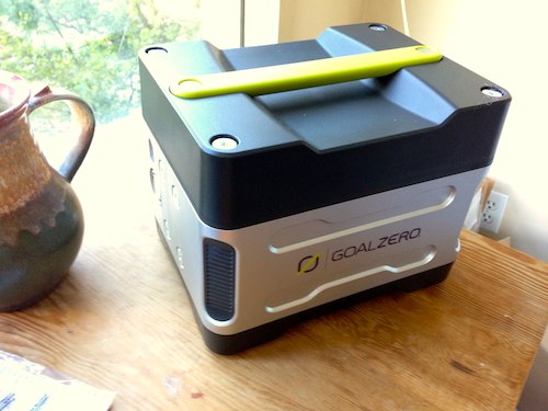 Goal Zero Yeti 400 just arrived. Basically a big arse battery for emergency power. Weighs about 13.kg! It has regular power outlets on the back, as well as USB and more, with enough juice to fuel just about anything but a refrigerator. My out-of-the-box impressions are very good: build quality seems excellent, design smart and clear.
