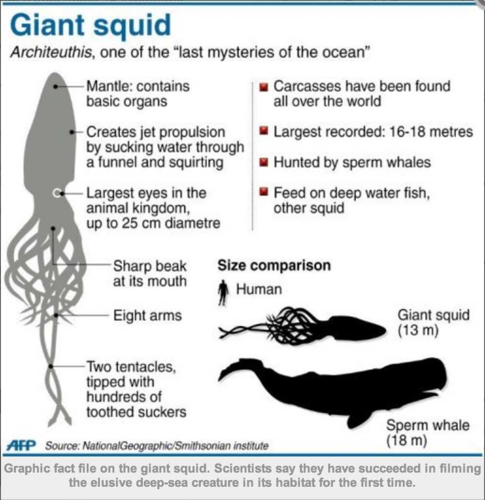 Giant squid filmed in Pacific depths, Japan scientists report. So great. I’ve been fascinated by architeuthis since I was much smaller than the human silhouette in the infographic: