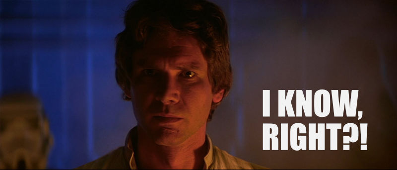 I’m fascinated by language and memetics and cheerfully and playfully embrace trendy words and expressions because I think their infectiousness is fascinating in its own right (regardless of how annoyingly trendy they might be). The origins of “I know, right?!” are murky at best, but it seems to be kin to Valleyspeak (see “up talk”), which isn’t really my style. Nevertheless, my wife and I have adopted it so thoroughly that “IKR” peppers our messaging. When I thought of Han’s famous “I know” recently, adding “right” seemed so obvious I couldn’t resist. And, freakishly, it seems like no one else has done this. Did I actually come up with something new on the Internet? Go forth, little meme…