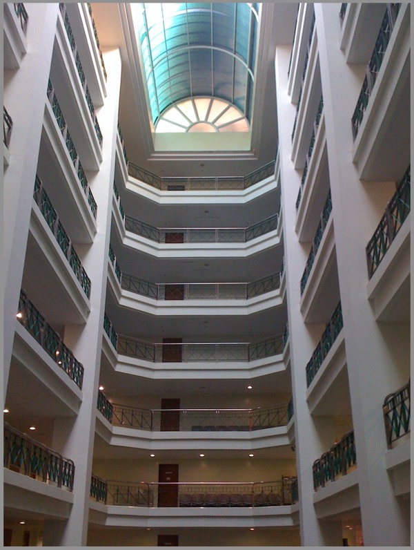 All I remember is an institutional vibe; a long, featureless white hallway outside the door; a small window, through which we could see a bit of Bangkok skyline.