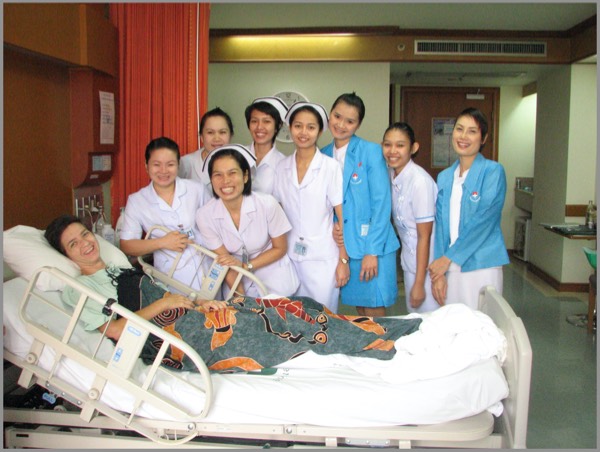 Laos does not have much of a medical system, while Thailand has one of the best in the world. So the first step was to move her to a private hospital in Udon Thani, a small city in northern Thailand, and the Australian doctor was able to arrange that almost immediately. He even accompanied her on the ambulance ride to Aek Udon Hospital, and she was “settled” there by our Wednesday morning.