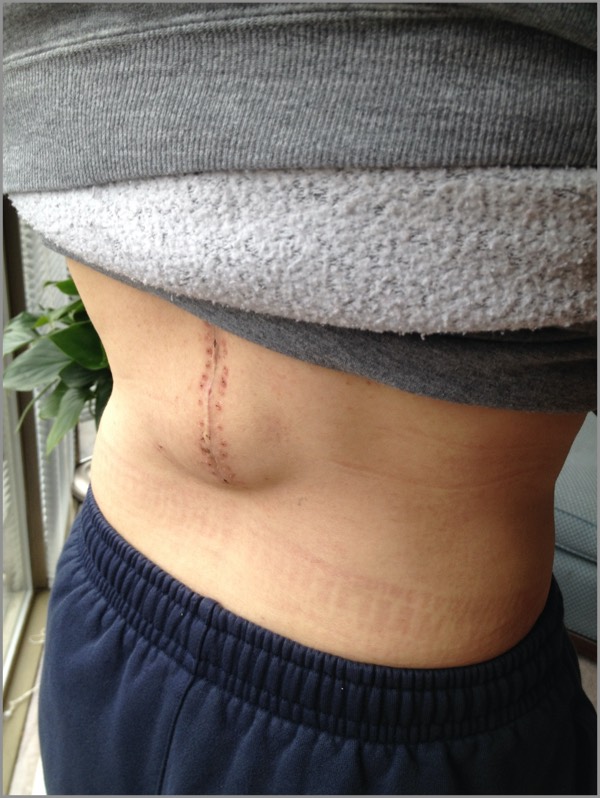 Two years later, Amy had the bars removed. They had become bothersome — a constant, nagging, uncomfortable presence. The procedure and recovery went well, other than the formation of an impressive seroma, a bunch of fluid trapped under the skin, common after surgeries. It was about the size and texture of a small breast. Seromas sometimes cause trouble, and consequently we aborted a planned trip to Hawaii — because the last thing we wanted was to travel to the US with a well-documented surgical complication in progress. If it got infected while we were in Hawaii, it would mean big trouble!