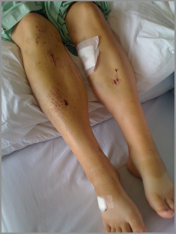 - moderate lacerations to the scalp and right shin