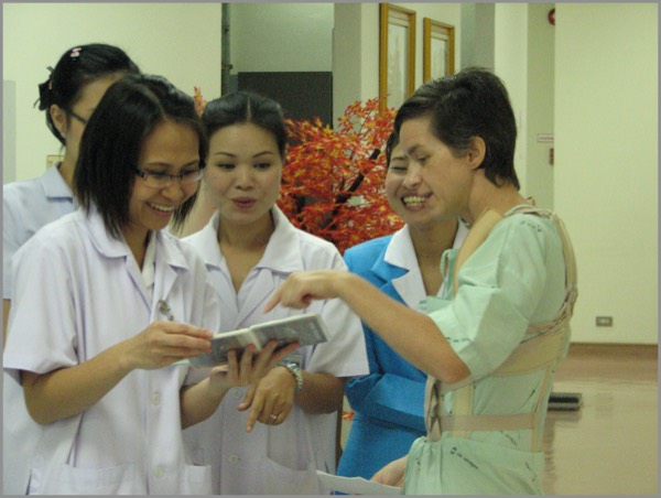 This was all very time-consuming, and Amy was in the rehab clinic a lot, and loving it. There was one young Thai physiotherapist who spoke good English with a Texan accent, which was odd — she had done a work exchange program in Texas. So she was “Miss Texas” for the rest of our stay. A small flock of other physios and nurses were are all hopeless at English, but Amy just saw that as a challenge: she spent pretty much her entire time there quizzing them on the Thai and Lao languages. Amy generally seems to regard her stay in the hospital here as being one big language lesson.