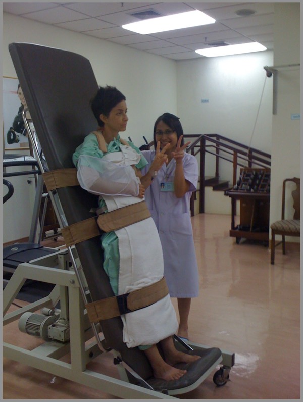 When you know you’re supposed to be able to stand and walk for your flight home in just a week or two at the most, the rate of progress on the tilt table did not seem adequate. But it accelerated. On the third day, she tolerated 70-80˚ for several minutes... twice. And on the fourth day, she went to 90˚ for several more minutes.